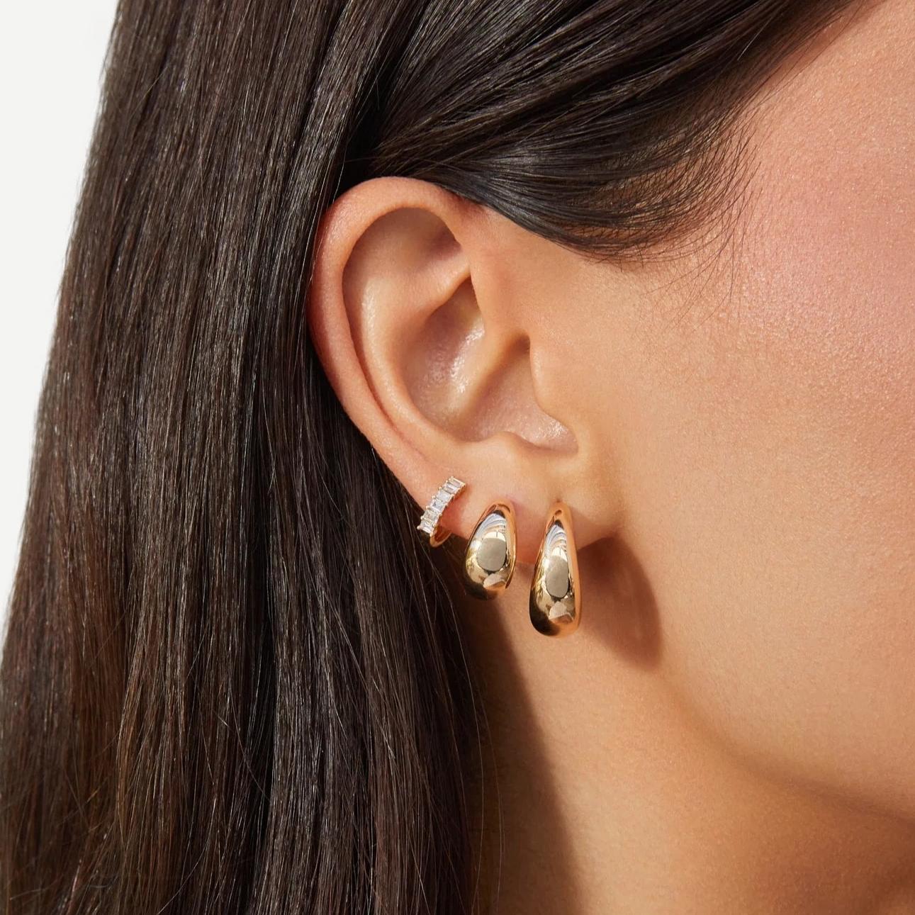 The Prong Set Diamond Baguette Huggie Earring is the little sister of the Prong Set Baguette Hoop. This huggie sparkles with six diamonds set along the front of the earring. Designed to add some glamour to your look, this earring is just as chic as it is classic.