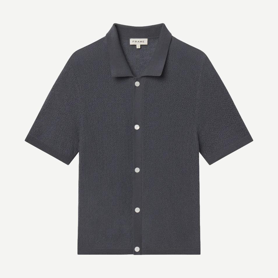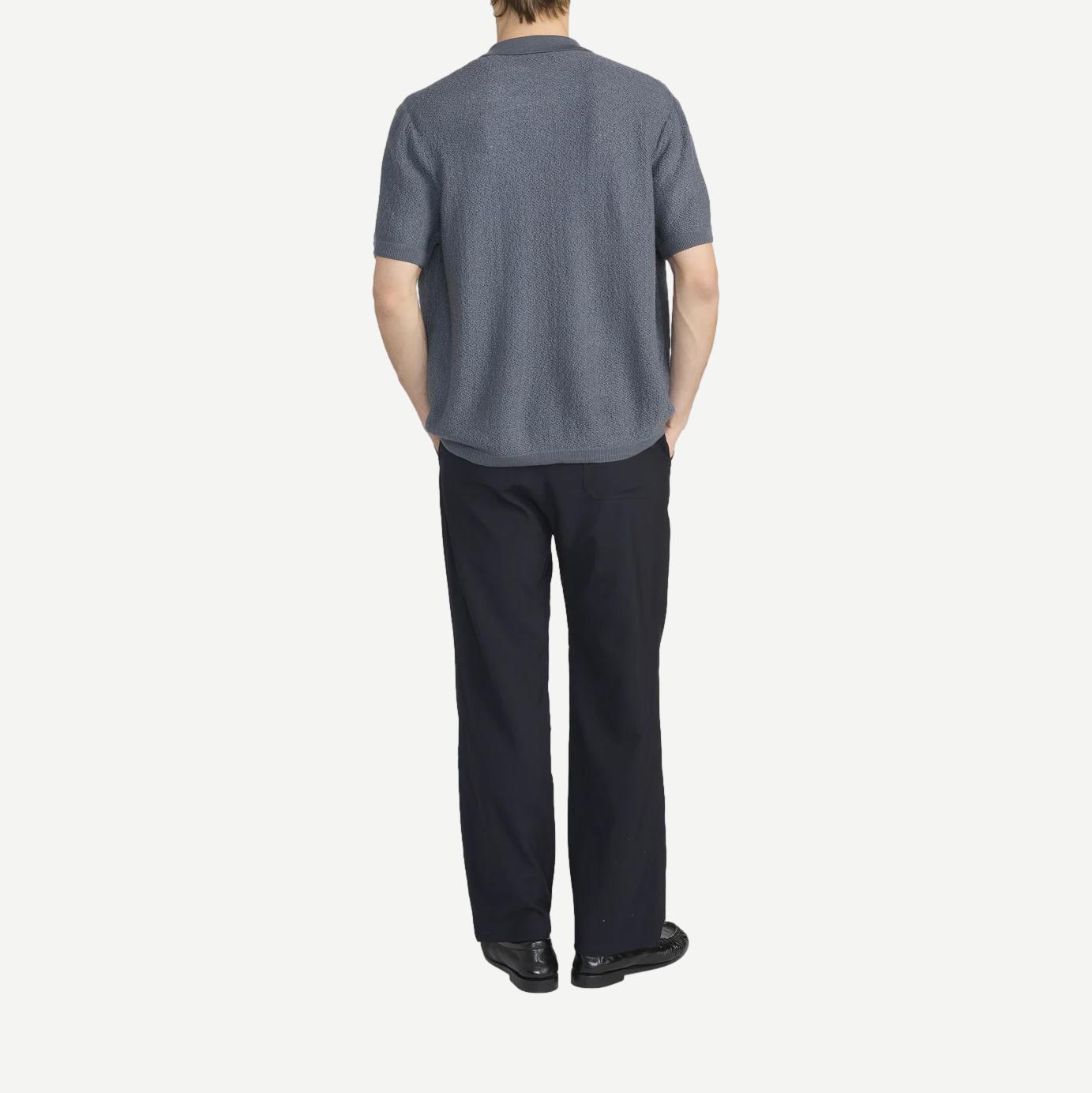 Cardigan Sweater is knit from 100% wool in a refined blue grey hue. Designed with a clean button-front and short sleeves, it offers a relaxed silhouette with a polished finish—easy to wear on its own or layered for transitional dressing.