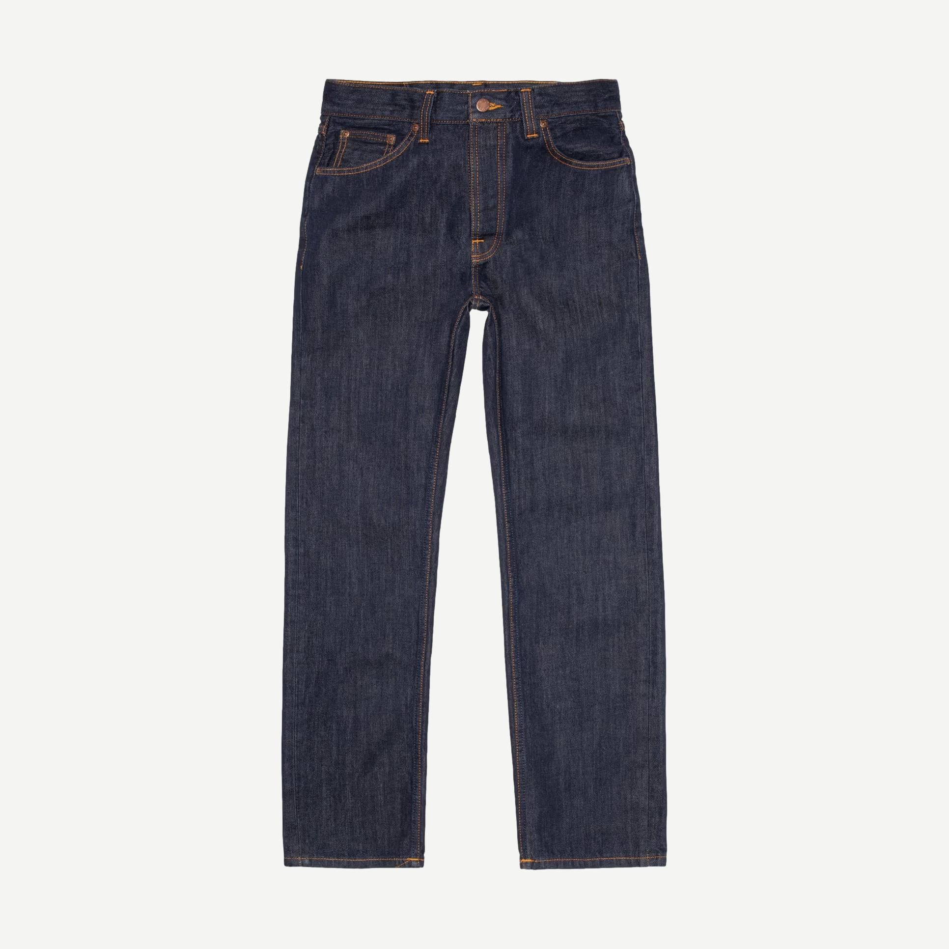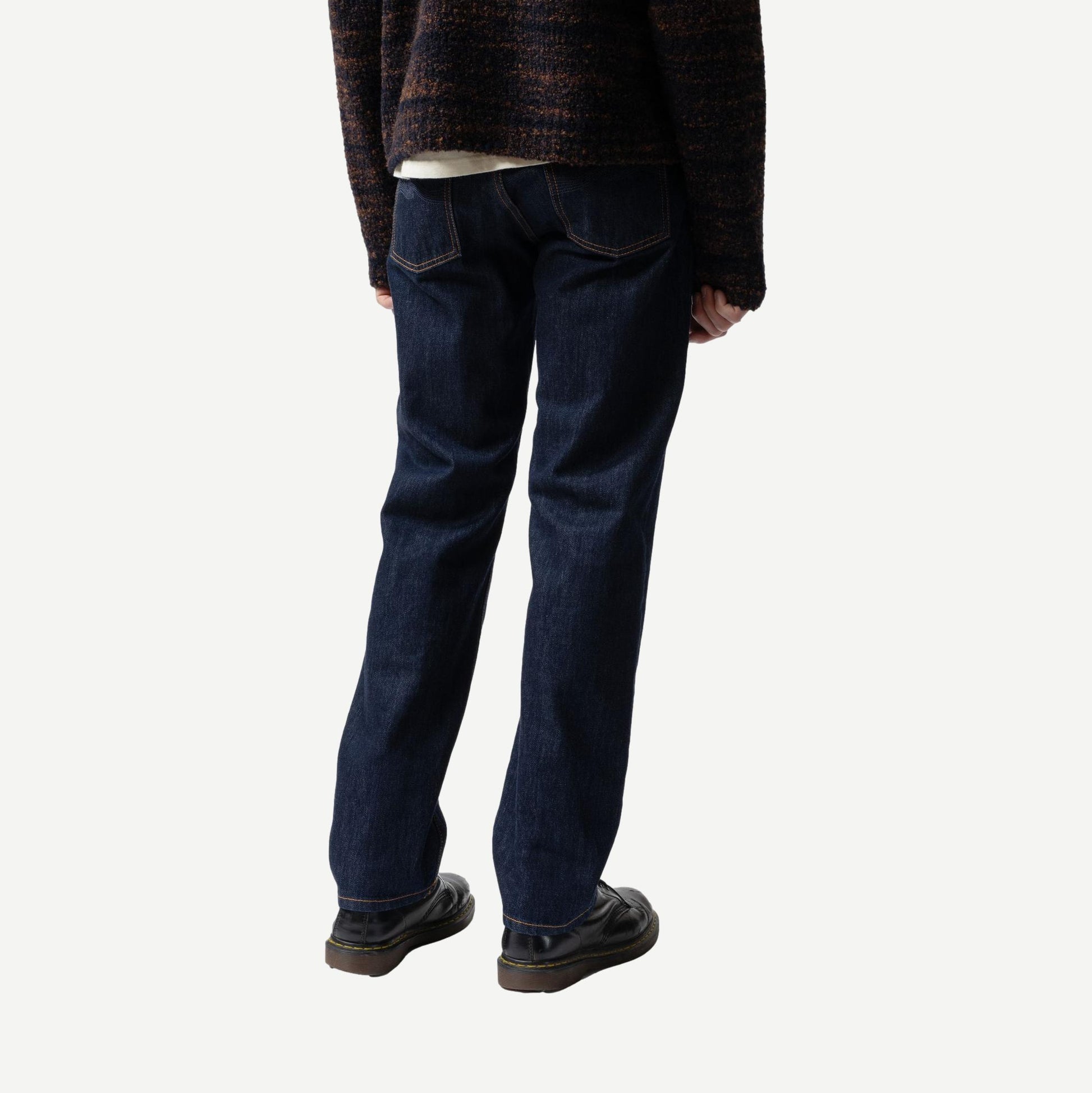 High-waist, regular-fit jeans with a straight leg, crafted from regenerative organic cotton in a beautifully simple deep blue wash. The inspiration behind this wash is refreshingly straightforward: a single home wash of dry denim. Crafted from vintage-style deep indigo denim with a medium slub character, the treatment shifts the hue from a dark blue to a rich, redcast blue, while transforming the denim's texture from flat to beautifully irregular and textured.