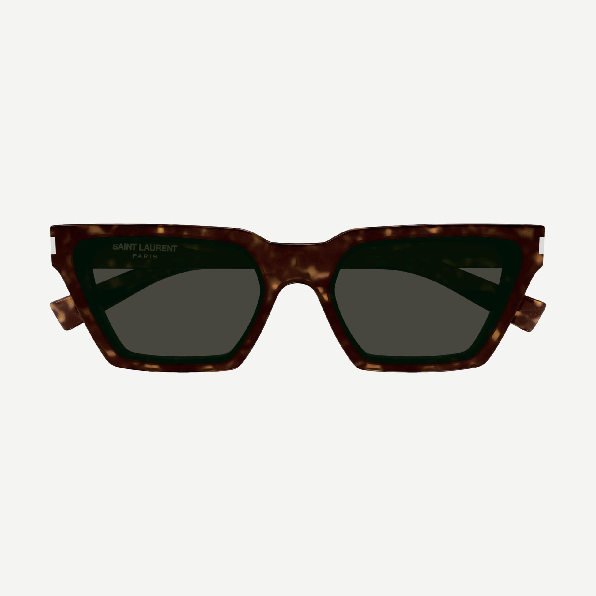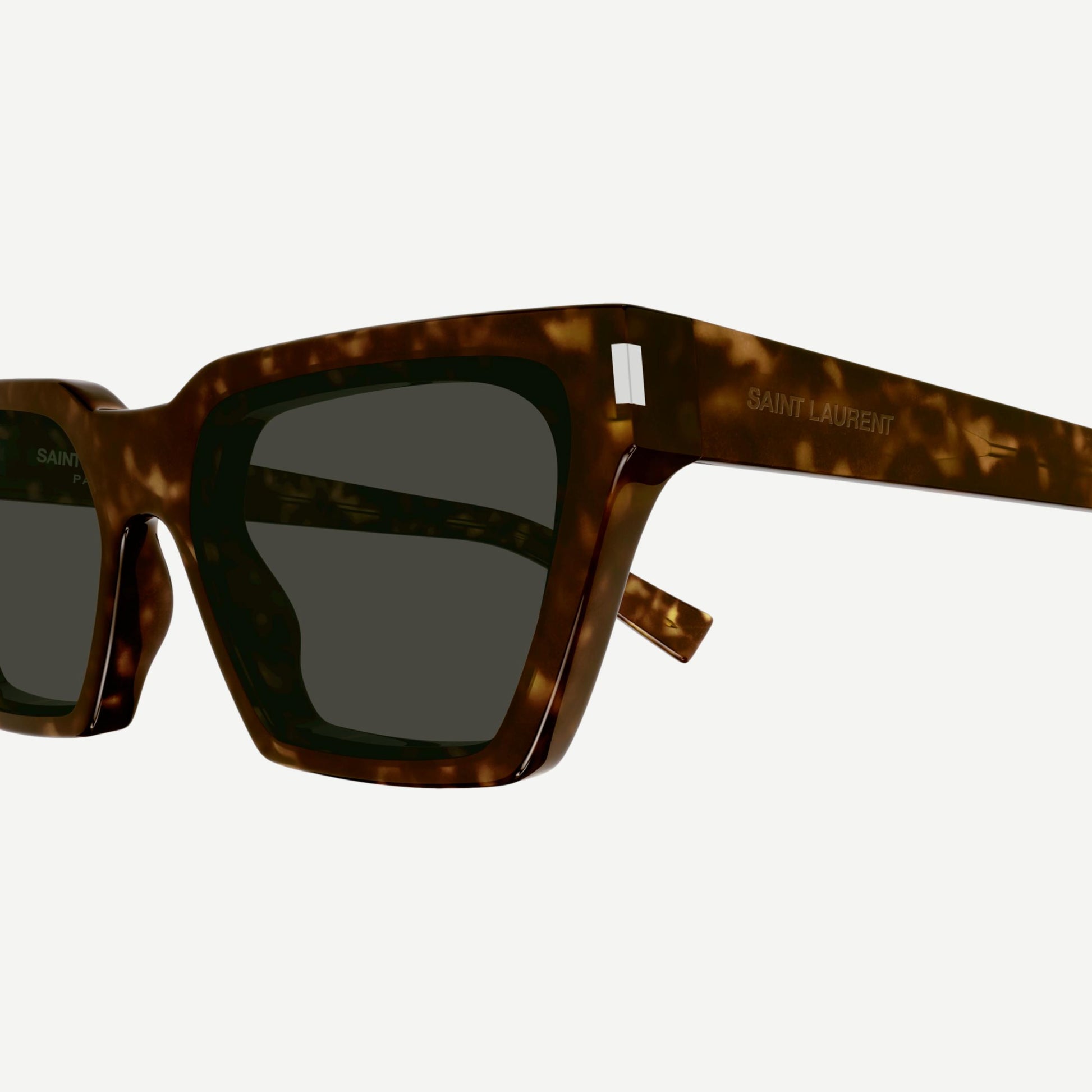 The distinctive cat-eye shape distinguished by Saint Laurent iconic corner angle and lens aligned to the acetate front. The logo Saint Laurent is laser engraved on both temples.