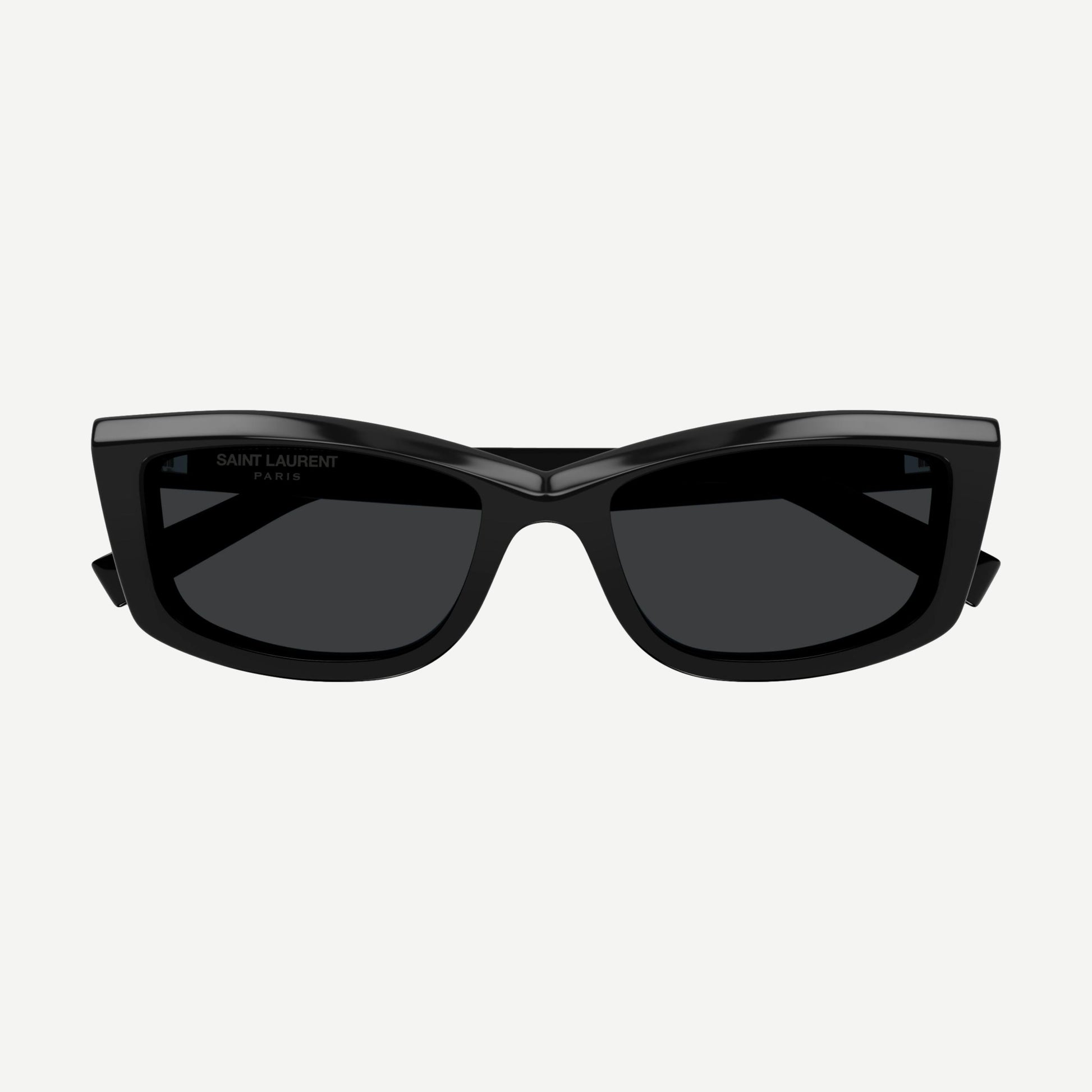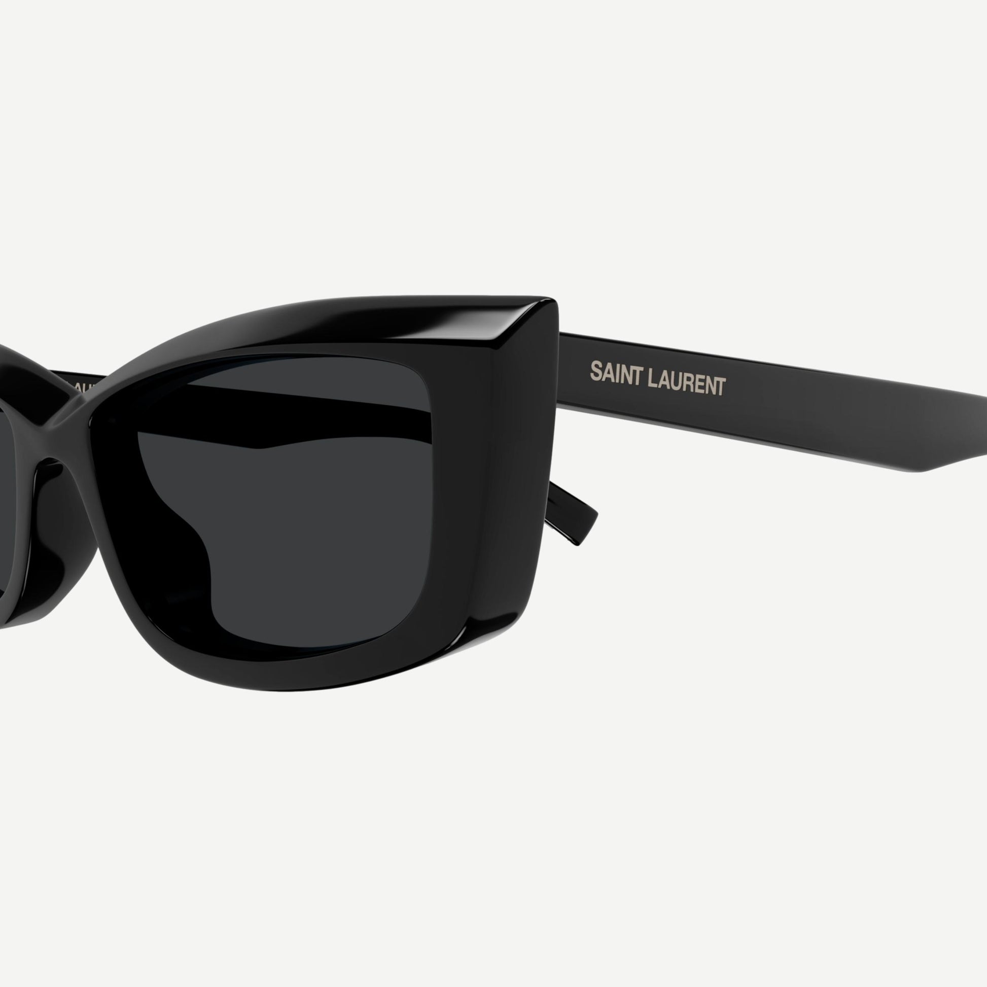 A simple, acetate construction is elevated by the sharp play of faceting on the front. Iconic curved design on the top line creating a narrow Cat Eye Shape. Saint Laurent laser engraved lettering logo on the temple.