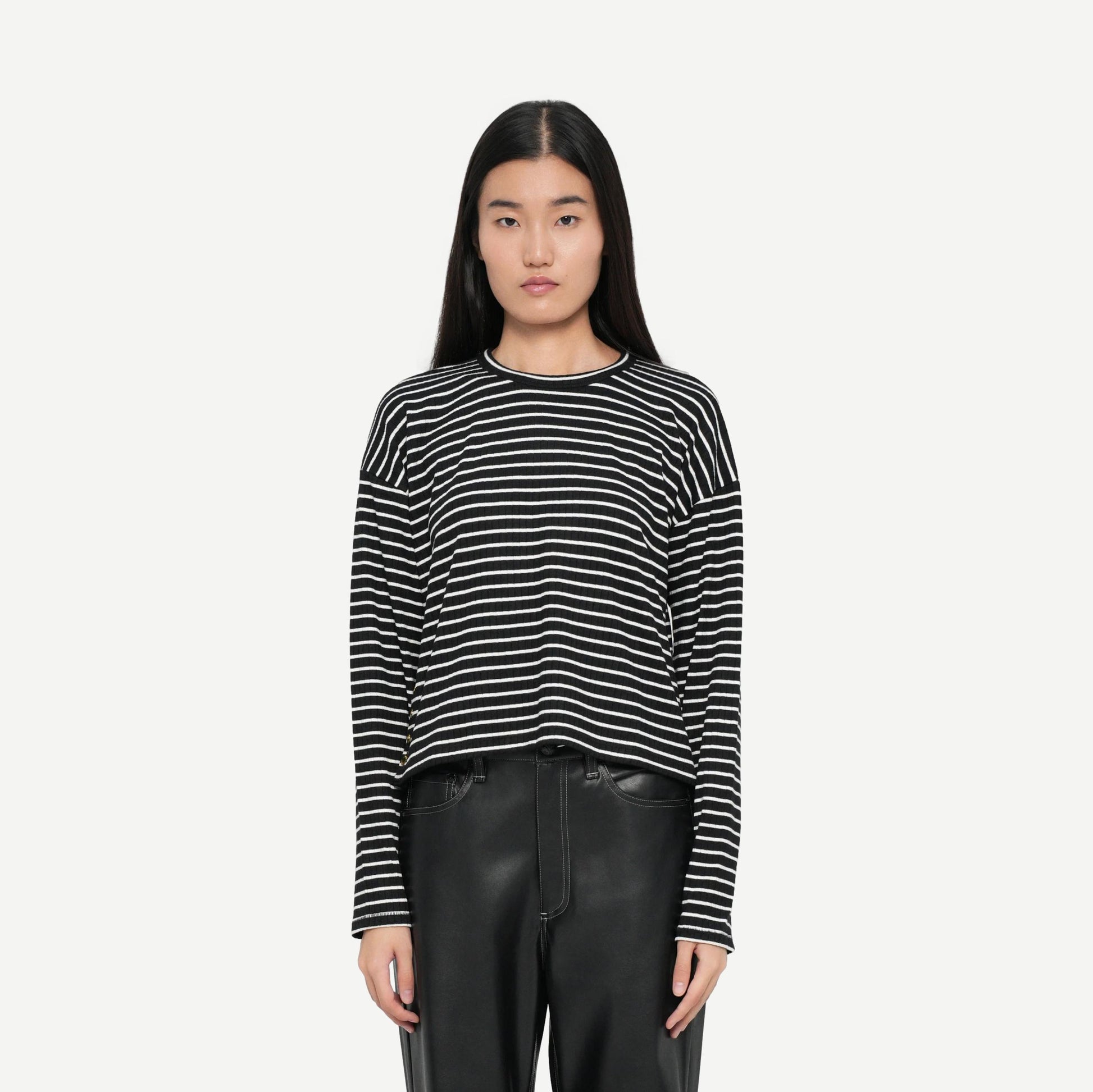 The Knit Stripe crewneck pullover by rag & bone is a refined essential. Designed with a crew neck and long sleeves, as well as button on the sides, this striped sweater brings warmth and polish to your everyday wardrobe. Pair it with tailored trousers or sleek leather pants for an effortlessly modern look.